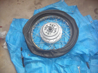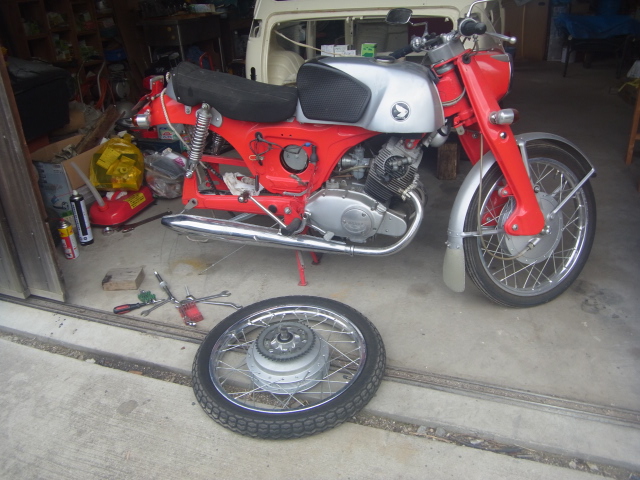 で、そのあれもこれもの一つにCB92があります。昨年初秋の頃パンクして、辛い坂道を押して帰ってから放置しっぱなしでした。そのパンク修理にとり掛かりました。