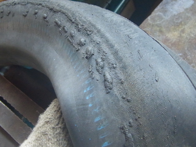 パンクしてからガレージまでかなりの距離を押したせいでしょうかチューブの表面にモコモコと毛玉状のゴムの塊ができていました。一応大きなゴム毛玉はこそげて取っておきます。